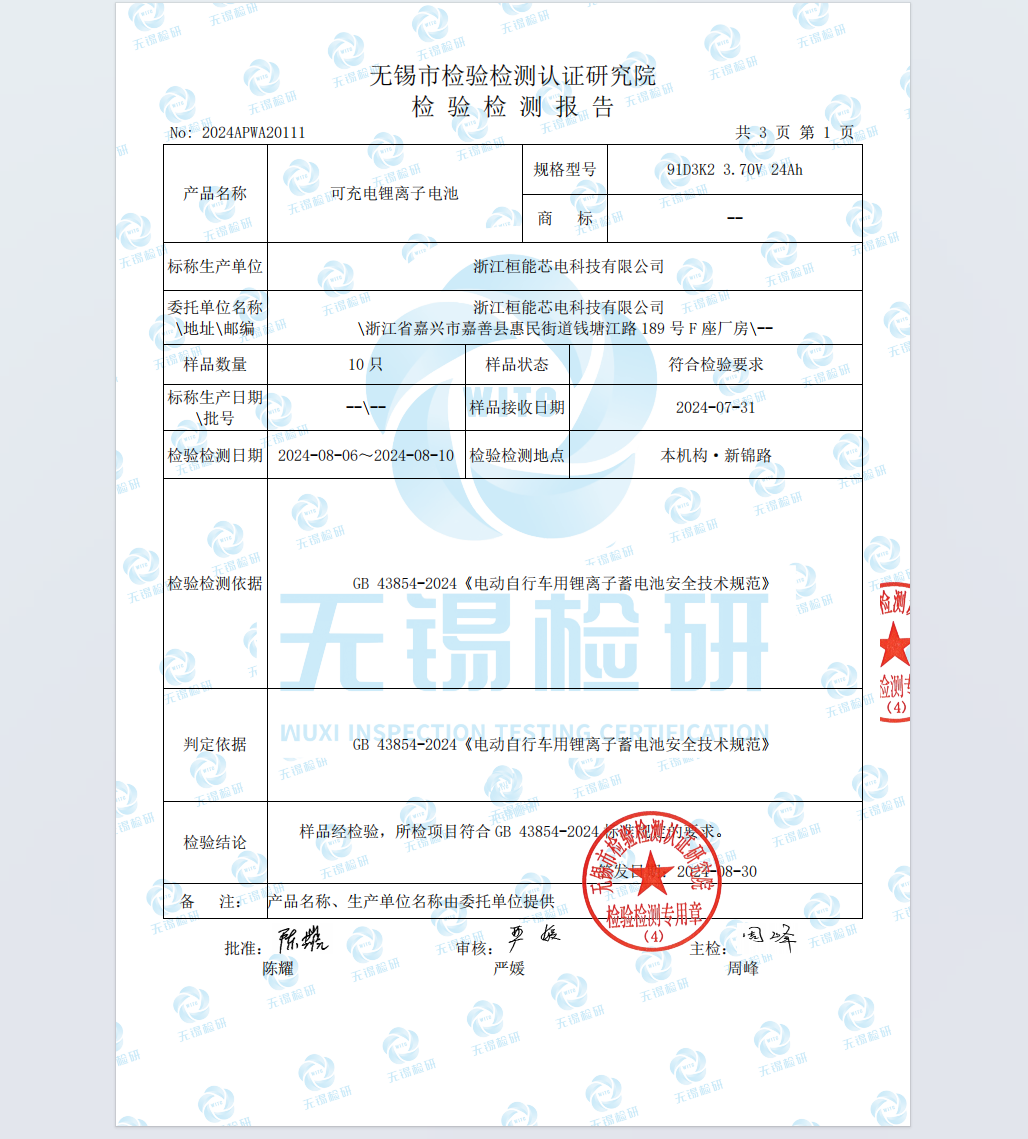 热烈庆祝桓能芯电公司锂电池通过(GB 43854-2024)强制性国家标准的测试